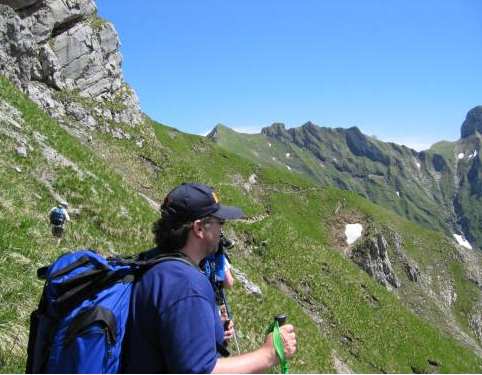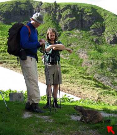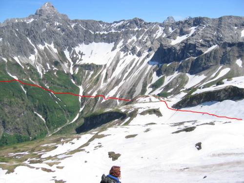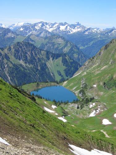 Der Laufbacher Eck-Weg verbindet das Edmund Probst-Haus am Nebelhorn bei Oberstdorf mit dem Prinz Luitpold-Haus am Hochvogel. In vielen Quellen liest man, dieser Höhenweg, der sich ständig auf einer Höhe von etwa 2000 Metern bewegt, sei der schönste seiner Art in den Allgäuer Alpen. Schwierigkeiten stellt der Weg an den Wanderer nicht. Allerdings können bis in den Sommer hinein Altschneefelder vorhanden sein, die vorsichtiges Gehen und entsprechende Trittsicherheit voraussetzen. Auch bei Nässe und nach starken Regenfällen ist entsprechende Vorsicht geboten. Nach Angaben des AV-Führers benötigt der Weg von Hütte zu Hütte etwa 4-5 Stunden Gehzeit, kann allerdings durch vorzeitigen Abstieg abgekürzt werden. Es ist zu beachten, dass es auf dem gesamten Weg keine Einkehrmöglichkeit, wohl aber Bachläufe zum Auffüllen des Wasservorrates gibt. Im Sommer 2004 war es dann auch für den BSV die erste gemeinsame Bergtour. Bereits in der Gondel zur Auffahrt aufs Nebelhorn hatte uns der Seilbahnführer darauf hingewiesen, die markierten Wege nicht zu verlassen. Noch am selben Abend war uns der Grund dafür klar. Seealpsee vom Laufbachereck-Weg | ||||||||||||||||||||||||||||||||||||||||||||||||||||||||||||||||||||||||||||||||||||||||||||||